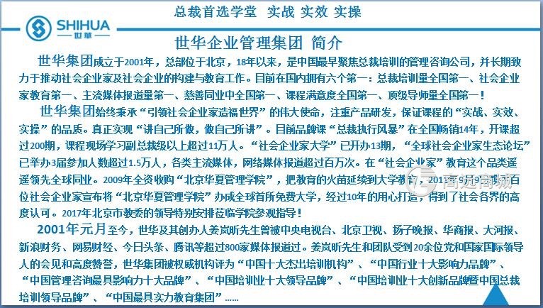 世華集團(tuán)成立于2001年,是中國(guó)最早聚焦總裁培訓(xùn)的管理咨詢公司,并長(zhǎng)期致力于推動(dòng)社會(huì)企業(yè)家及社會(huì)企業(yè)的構(gòu)建與教育工作。旗下有總裁班板塊、社會(huì)企業(yè)家實(shí)修大學(xué)、北京華夏管理學(xué)院(中國(guó)首所免費(fèi)大學(xué))、云學(xué)科技……